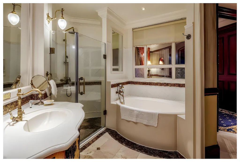Appreciate the stunning Ocean View on a European style balcony or daydream with comfort on the pleasant stylish lounge. In this spacious 46 sqm sanctuary, each feature like handcrafted carvings, gorgeous carpets, high ceilings, marble bathrooms and plenty of space are thoughtfully disposed to honor you with the royal touches. If you are a business traveler, take advantage of the in-room working station during your trip.